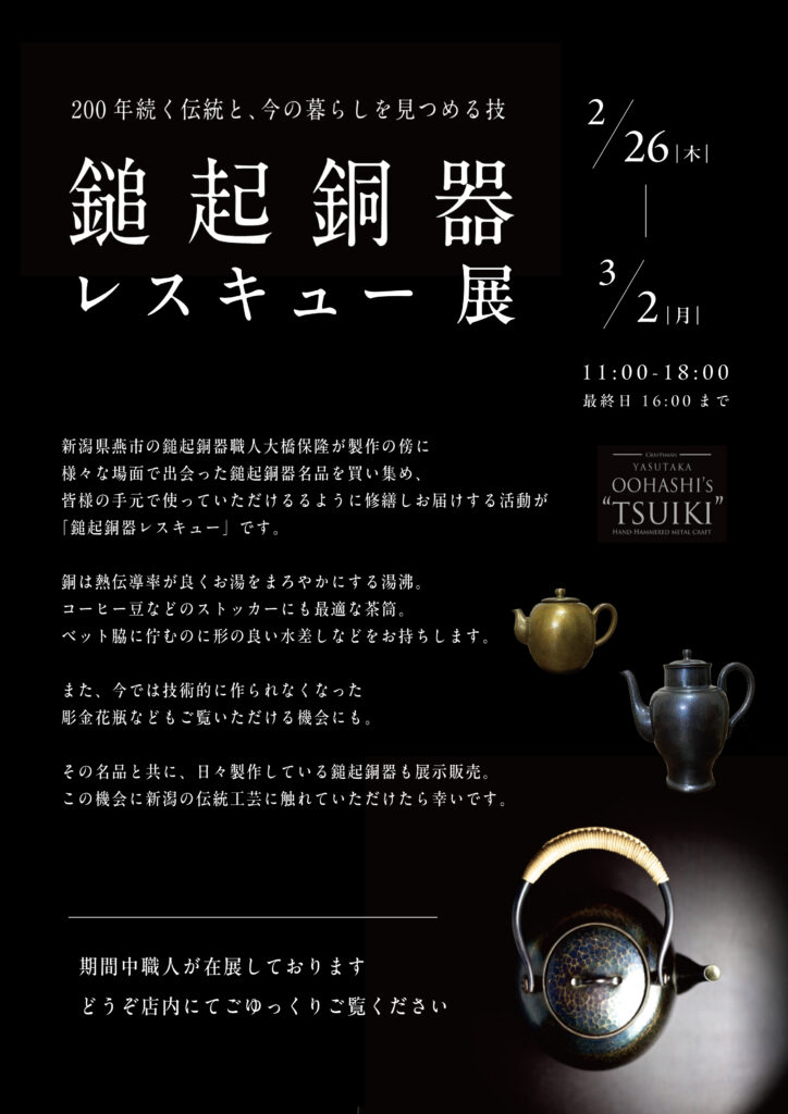 県燕市の鎚起銅器職人大橋保隆が製作の傍に様々な場面で出会った鎚起銅器名品を買い集め、皆様の手元で使っていただけるるように修繕しお届けする活動が「鎚起銅器レスキュー」。銅は熱伝導率が良くお湯をまろやかにする湯沸。コーヒー豆などのストッカーにも最適な茶筒。ベット脇に佇むのに形の良い水差しなどをお持ちします。また、今では技術的に作られなくなった彫金花瓶などなどもご覧いただける機会にも。その名品と共に、日々製作している鎚起銅器も展示販売、この機会に新潟の伝統工芸に触れていただけたら幸いです。